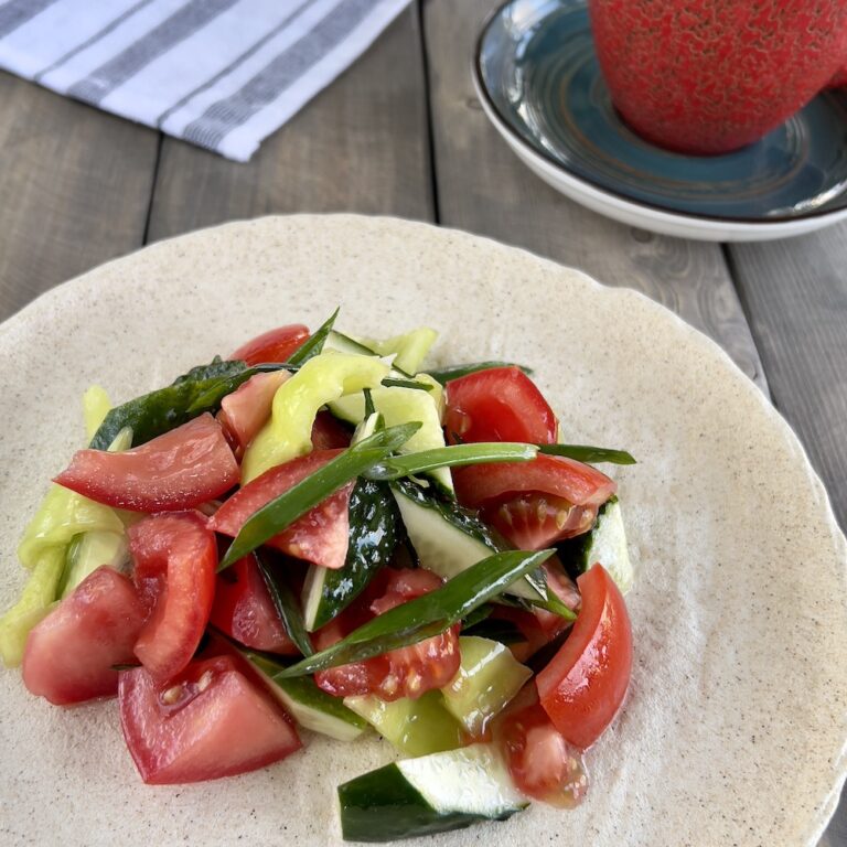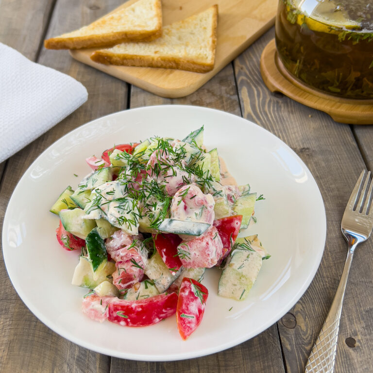 Помидоры, огурцы, зелень укроп, сметана домашняя, соль.
