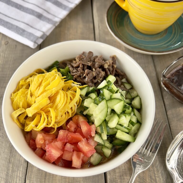 Говядина вырезка, соевый соус, лапша спагетти, помидоры, огурцы, яйца куриные,