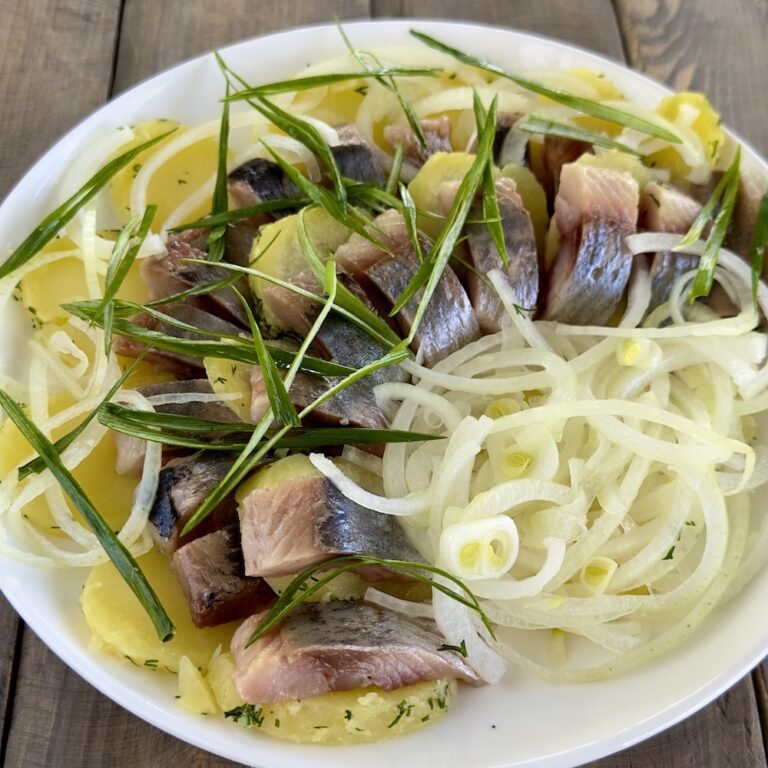 Сельдь соленая, картофель, лук репчатый, уксус, масло сливочное, зелень лук,
