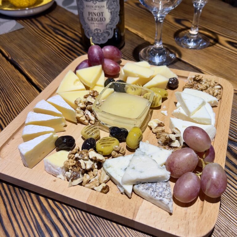 Пять видов сыра: Бри, Гальбани, Маасдам, Пармезан, брынза. Мед пчелиный, оливки